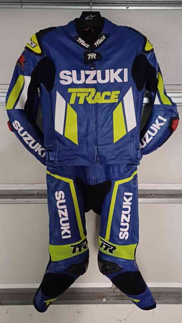 Kožená 2 – dílná sportovní kombinéza od značky TTRace v barvách Suzuki ve velikosti – 50 (M). Ideální na postavu cca. 170–178 cm, váha 70–76 kg. Je málo použitá, celkově ve velmi dobrém stavu.
