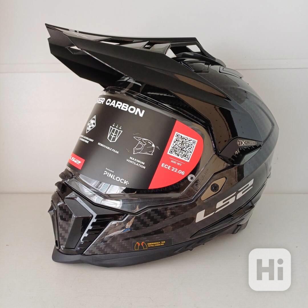 Enduro přilba od značky LS2 model Explorer Carbon Glos s plexištítem a integrovanou sluneční clonou ve velikostech M + L. Je nová a samozřejmě ve výborném stavu. Včetně originální krabice a příslušenství. Explorer je vrcholový model helmy od LS2.